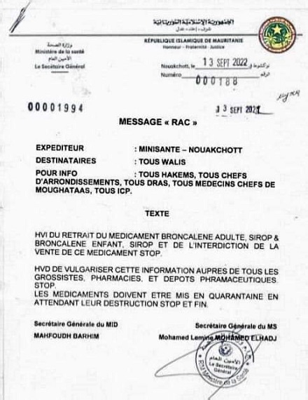 طلبت وزارة الصحة فى تعميم أصدرته أمس الثلاثاء موجه لكافة الولاة والحكام ومديرى الصحة الجهويين والاطباء الرئيسيين والممرضين الرئيسيين بالنقاط الصحية على عموم التراب الوطني بسحب دواء broncalene /sp للبالغين وbroncalene/sp (...)