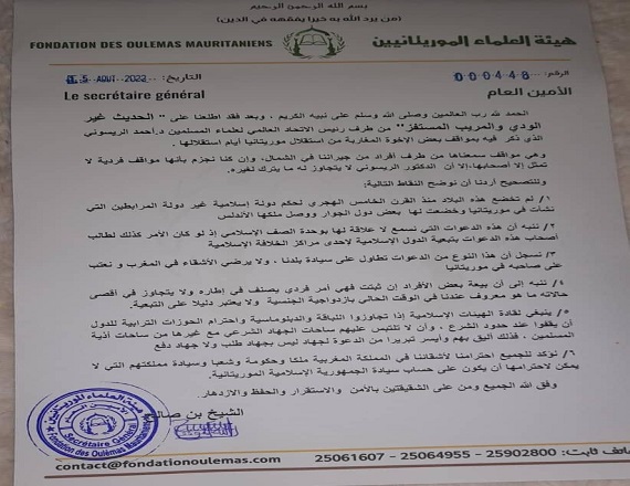 وصفت هيئة العلماء الموريتانيين تصريح رئيس الاتحاد العالمي لعلماء الموريتاني أحمد الريسوني، بشأن موريتانيا بأنه مريب وغير ودي ومستفز. ولفتت هيئة العلماء الموريتانيين في بيان إلى أن موريتانيا لم تخضع منذ القرن الخامس الهجري (...)