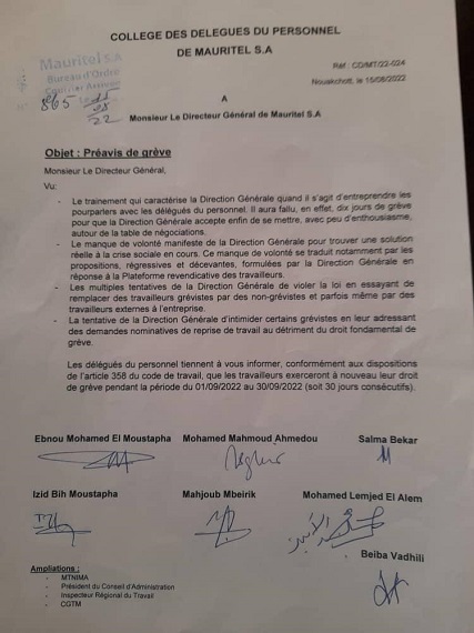 ودع عمال شركة موريتل إشعارا بإضراب جديد عن العمل يستمر لمدة شهر، لفرض إيجاد حلول لمطالبهم. وأودع العمال الإشعار بالإضراب لدى إدارة الشركة، ويبدأ من 1 سبتمبر القادم ويستمر حتى 30 من الشهر نفسه. ويرفض العمال "تلكؤ" إدارة (...)